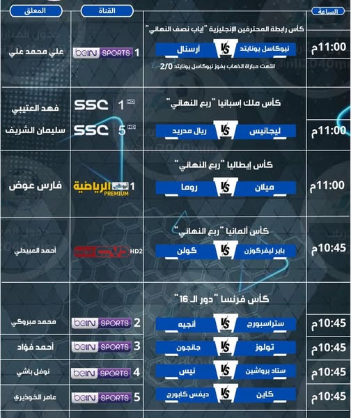 | أبرز مباريات اليوم الثلاثاء 4 فبراير 2025 والقنوات الناقلة | اسلا م محمد | ترددات القنوات الرياضية | 2 | 4 - 2 - 2025 8:39 AM |